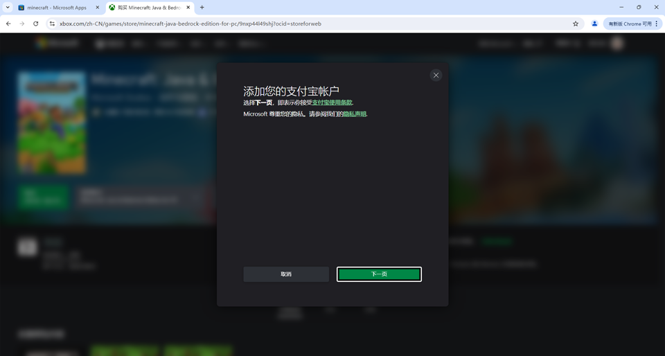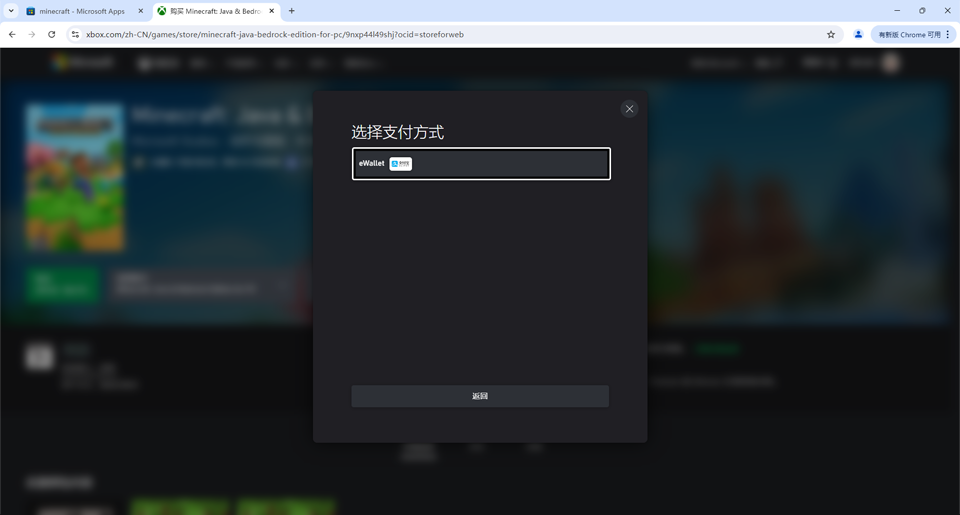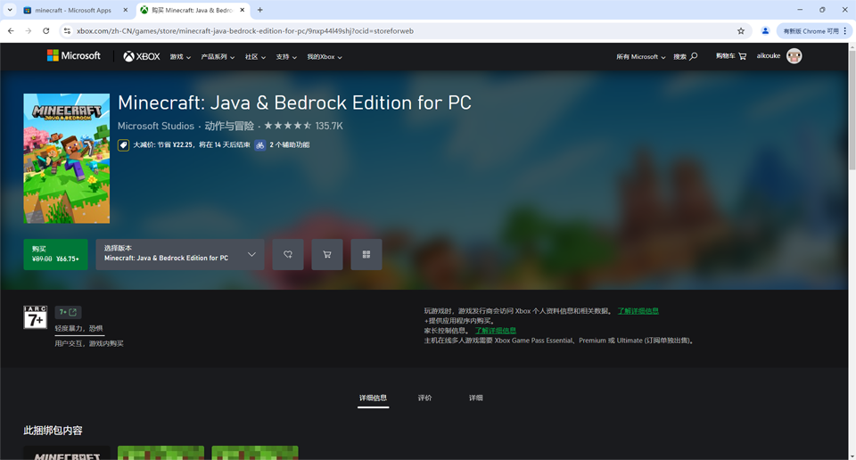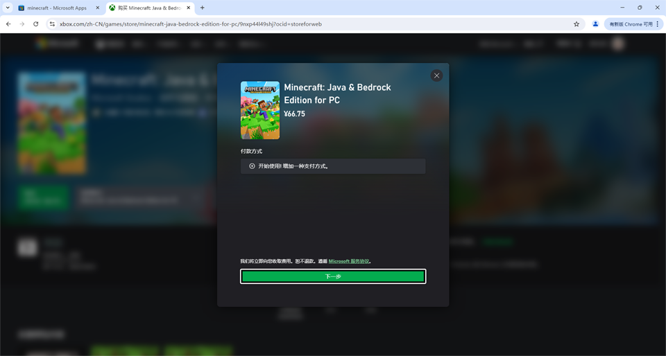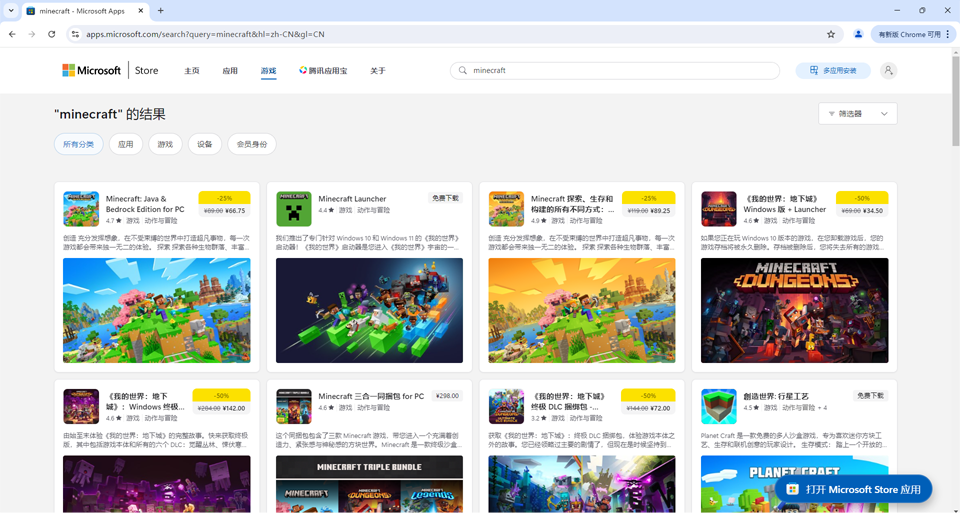 用浏览器打开 https://apps.microsoft.com 或点击这里>>进入microsoft store,或者使用windows自带的microsoft store,搜索:minecraft 并下单。